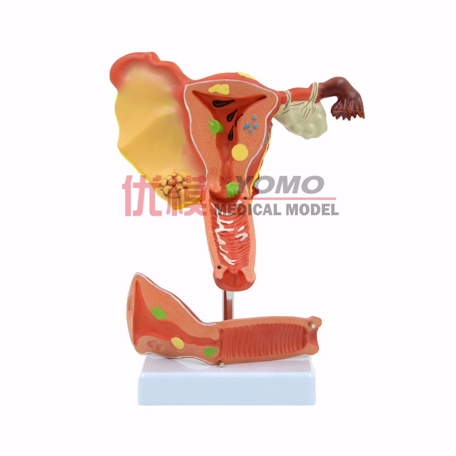此款模型展示了女性?xún)?nèi)生殖器的病理形式,包括纖 維liu,粘膜下 ji liu,壁內(nèi)ji liu,輸卵 guan 炎,卵巢nang 腫,念珠 jun 病,子宮內(nèi) mo 炎,內(nèi)膜息 rou 等病變及其位置。