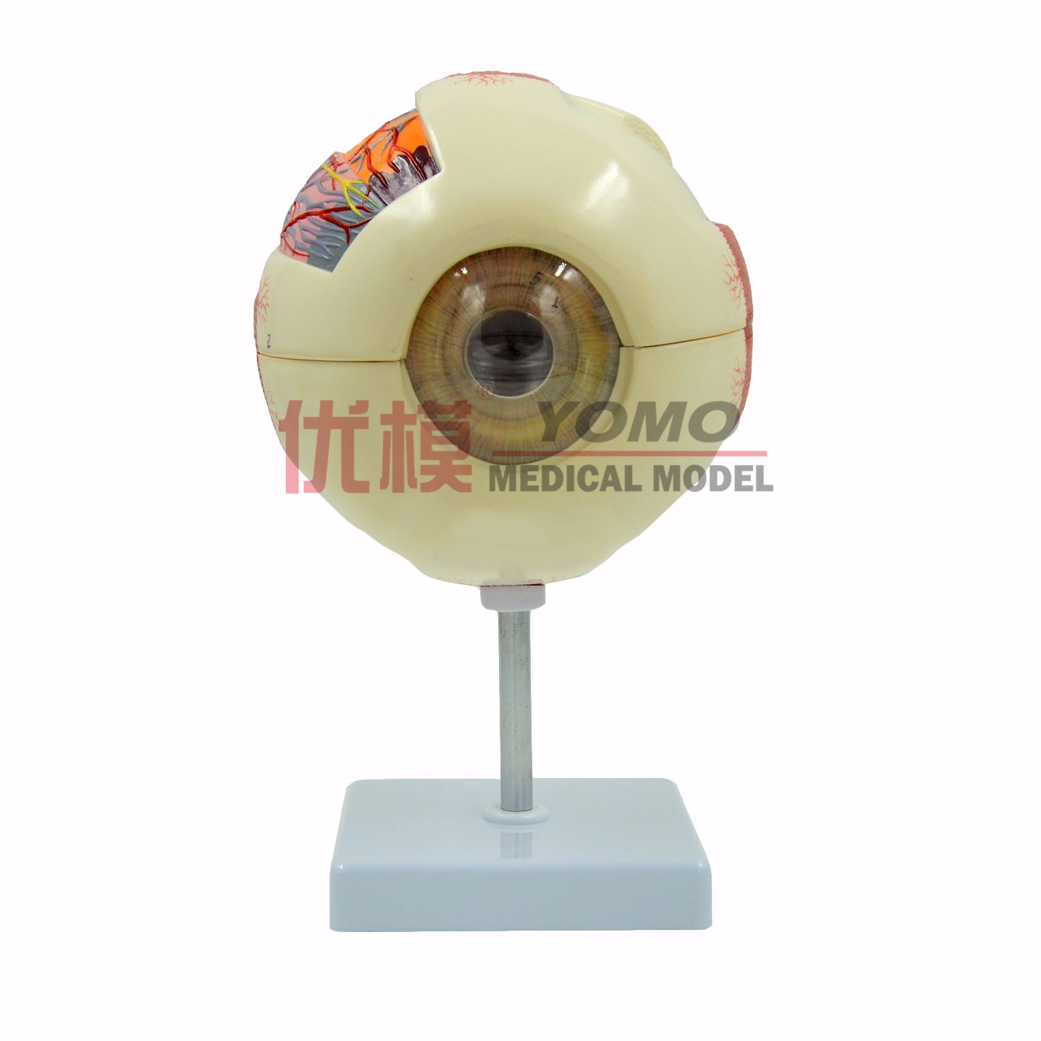 此模型為眼球模型,6倍大,6部件,此眼球模型正中矢狀切,出示了眼球詳細的內(nèi)部結(jié)構(gòu)。角膜,虹膜,晶狀體,玻璃體可自由拆裝,其中鞏膜上的肌肉附著和部分脈絡(luò)膜也可以觀察到。