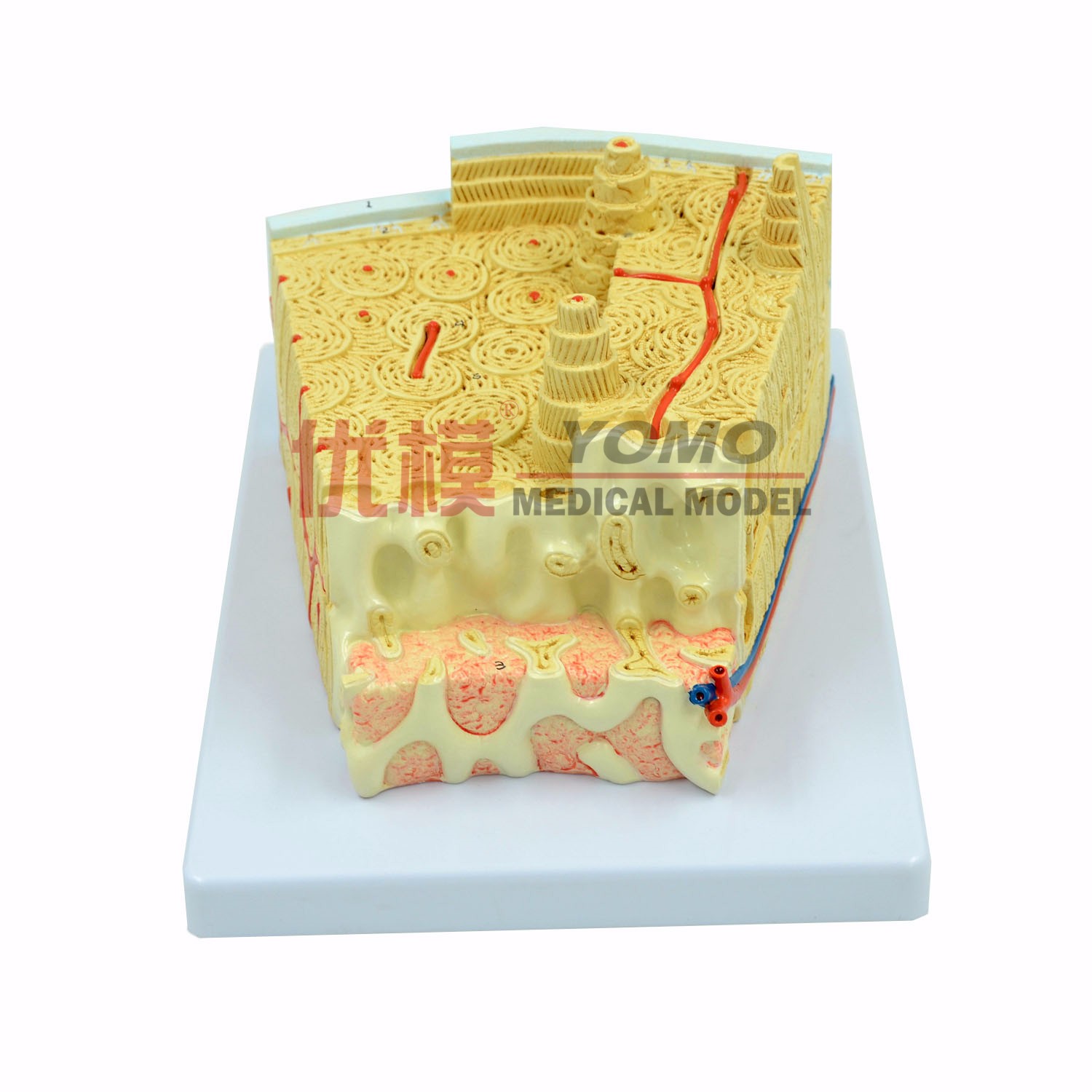 此款模型以三維立體表現(xiàn)板層骨的一個斷面,放大80倍展示了典型的管狀骨胳。表現(xiàn)的是骨骼各個層次的縱切面橫切面,以及一個骨髓內(nèi)結(jié)構(gòu)的兩級切面。
