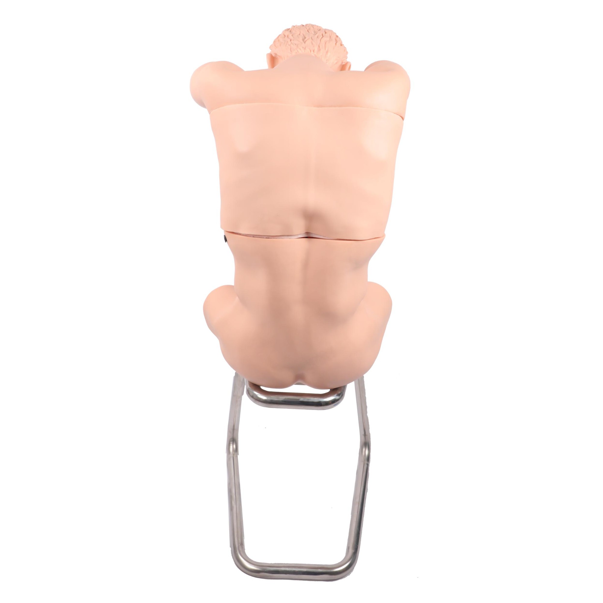 ■仿真標(biāo)準化病人反向坐于靠背椅上,雙臂平置,形象逼真