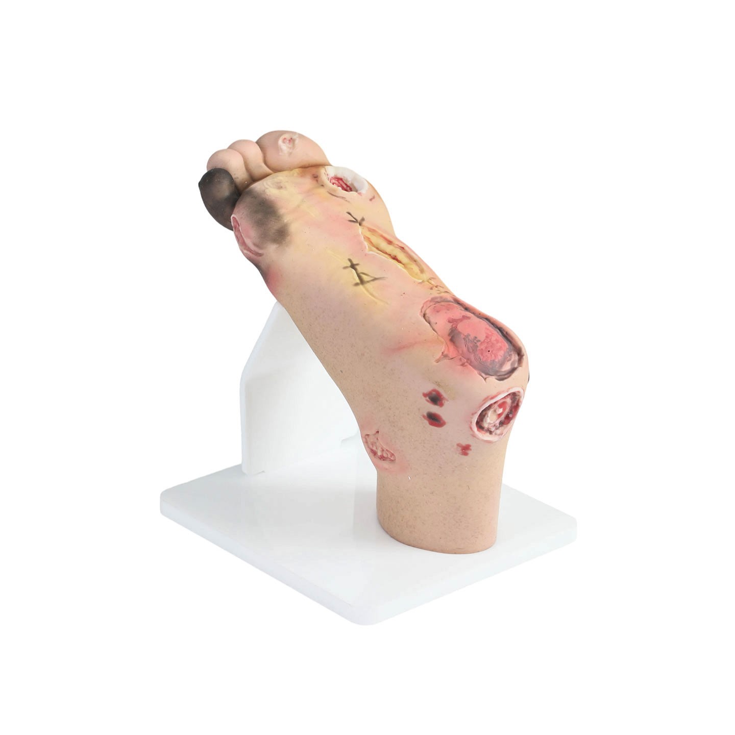這款專(zhuān)為糖尿病足部病理護(hù)理培訓(xùn)設(shè)計(jì)的模型,精準(zhǔn)聚焦糖尿病引發(fā)的足部問(wèn)題。采用柔軟且富有彈性的材料制作,腳趾不僅可靈活彎曲,高度還原真實(shí)觸感,更便于學(xué)員實(shí)操。模型精心設(shè)置侵入性變化,能呈現(xiàn) 1、2、3 腳趾周?chē)p微感染狀態(tài),讓學(xué)員熟悉早期干預(yù)處理。同時(shí),直觀展示腳趾截肢、夏柯氏足、壞疽等嚴(yán)重病變,為學(xué)員提供全面學(xué)習(xí)場(chǎng)景。無(wú)論是醫(yī)護(hù)院校教學(xué),還是在職醫(yī)護(hù)人員技能精進(jìn)培訓(xùn),它都是掌握糖尿病足部病變護(hù)理的