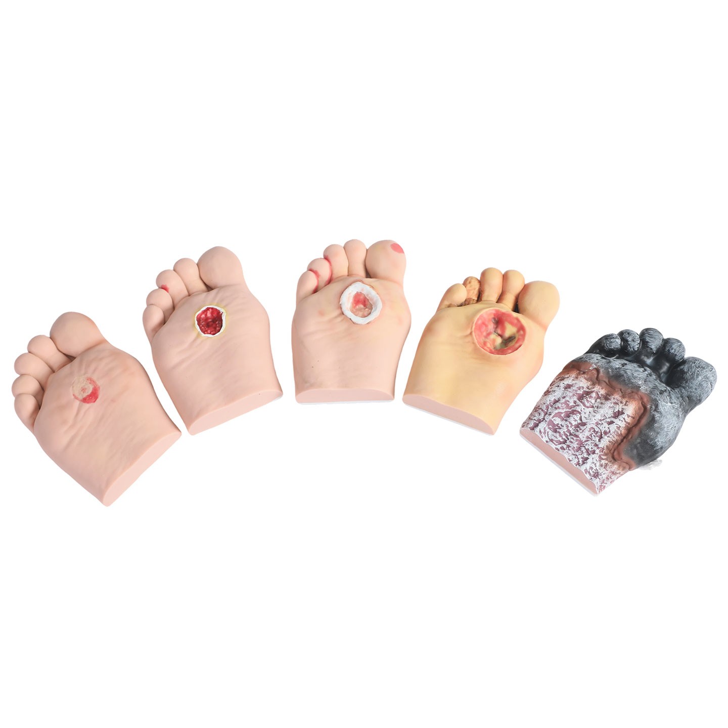 主要功能:模型設(shè)計(jì)為糖尿病導(dǎo)致的足部病理變化,學(xué)員可進(jìn)行病變的護(hù)理。5種程度的糖尿病足展示。展示嚴(yán)重的足部病變,如腳趾截肢、夏柯氏足和壞疽等。模型材料柔軟有彈性,腳趾可彎曲。