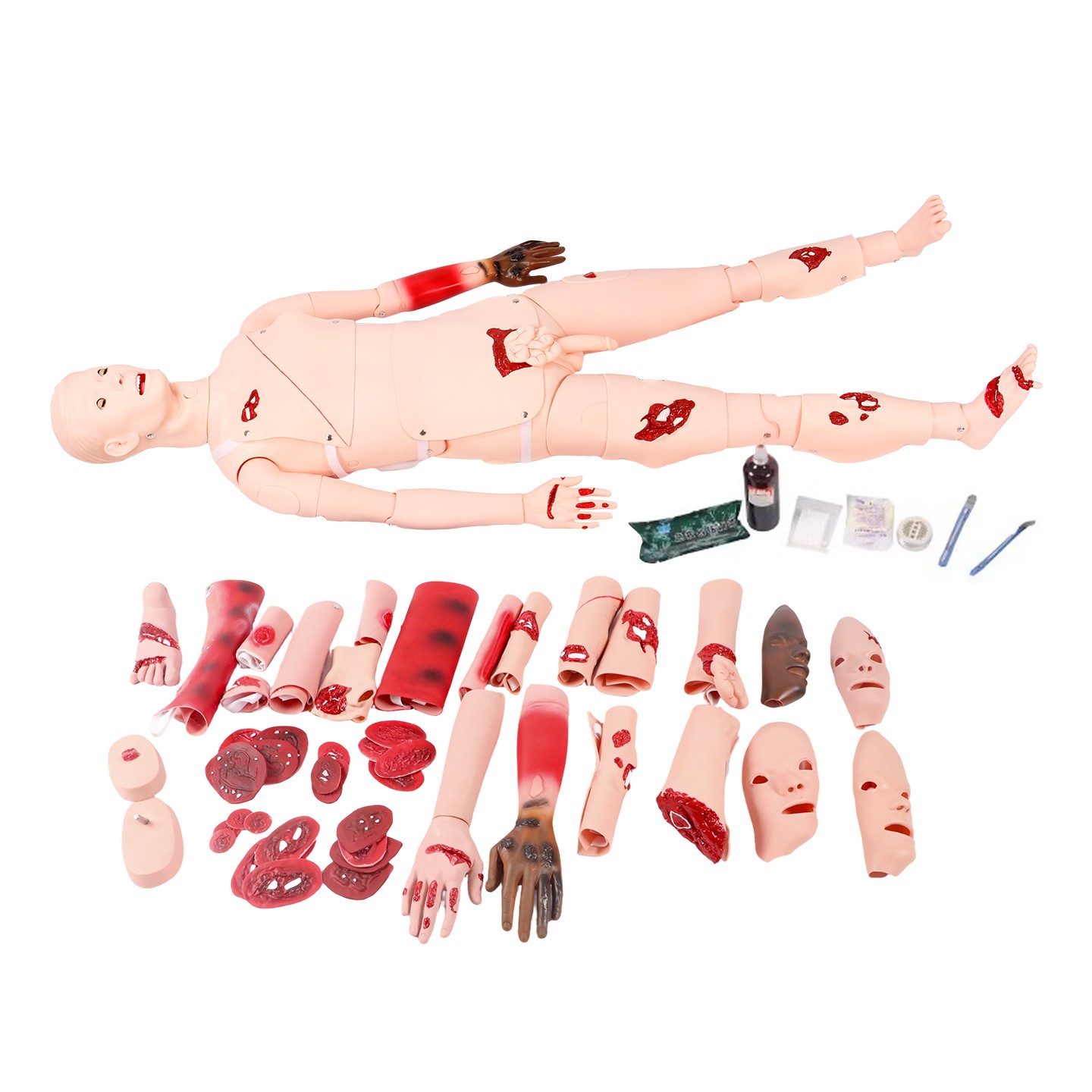 該產(chǎn)品新增創(chuàng)傷護(hù)理功能,極大增強(qiáng)現(xiàn)場(chǎng)處理及護(hù)理培訓(xùn)的真實(shí)感。一方面,,涵蓋從基礎(chǔ)的洗頭、洗臉,到各類插管、穿刺、注射、導(dǎo)尿等醫(yī)療操作,還有胸腔解剖展示及整理護(hù)理內(nèi)容;另一方面,新增大量創(chuàng)傷模塊,涉及面部、肢體多處燒傷、骨折、開(kāi)放性傷口、槍彈傷、異物刺傷等多種創(chuàng)傷情形,各創(chuàng)傷部位附模擬出血點(diǎn),全方位滿足復(fù)雜多樣的培訓(xùn)需求