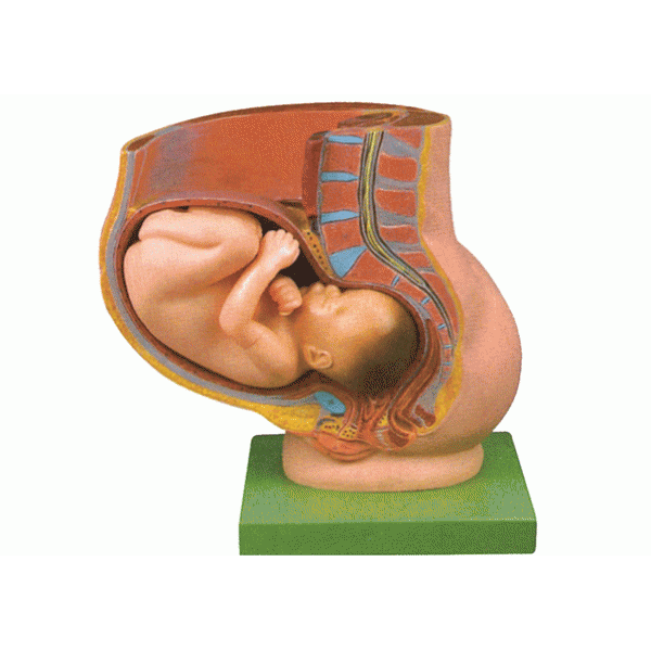 該模型由骨盆子宮和妊娠九個(gè)月胎兒兩個(gè)部件組成,并顯示子宮、陰道、膀胱、直腸和胎兒、羊膜、胎盤、臍帶等結(jié)構(gòu),共有38個(gè)部位指示標(biāo)志。