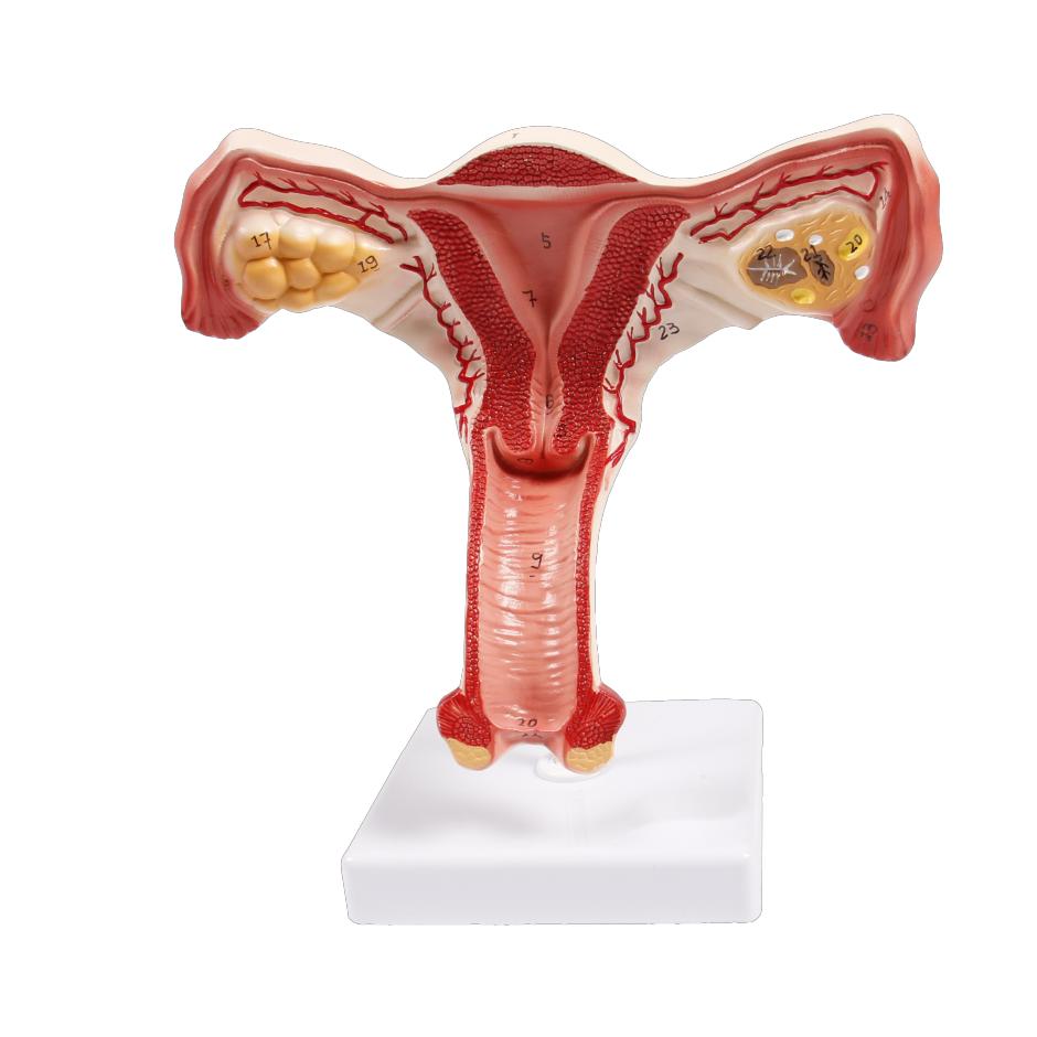 本模型顯示子宮三層結(jié)構(gòu),子宮腔陰道示穹隆,左側(cè)示卵巢、輸卵管各部和子宮闊韌帶的關(guān)系,右側(cè)卵巢剖面示黃體、卵泡、子宮血管及子宮圓韌帶等。