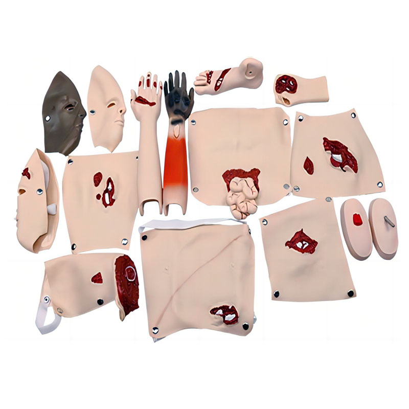 ?該創(chuàng)傷功能模塊呈現(xiàn)了極為多樣且逼真的創(chuàng)傷場(chǎng)景。從面部到四肢,各類(lèi)傷情應(yīng)有盡有。面部涵蓋了 ⅠⅡⅢ 度燒傷以及前額撕裂傷口、頜骨創(chuàng)傷,給頭面部創(chuàng)傷救治提供模擬。身體軀干部分有鎖骨開(kāi)放性骨折與胸膛挫傷、腹部創(chuàng)傷伴小腸突露,考驗(yàn)胸腹外傷處理能力。四肢更是重災(zāi)區(qū),右上臂、右手、右大腿、右小腿、右足多處出現(xiàn)開(kāi)放性骨折、軟組織撕裂、槍彈傷、金屬異物刺傷等,還有左前臂燒傷、左大腿截?cái)鄤?chuàng)傷,為創(chuàng)傷急救培訓(xùn)提供了豐富素材。