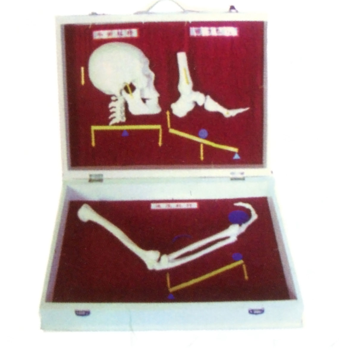由頭顱骨(含下頜骨)的矢狀切,第1-5頸椎的矢狀切,脛骨和腓骨下段、距骨、肱骨、前臂骨、手骨(示手舟骨、頭狀骨、第三掌骨和中指骨)等組成。