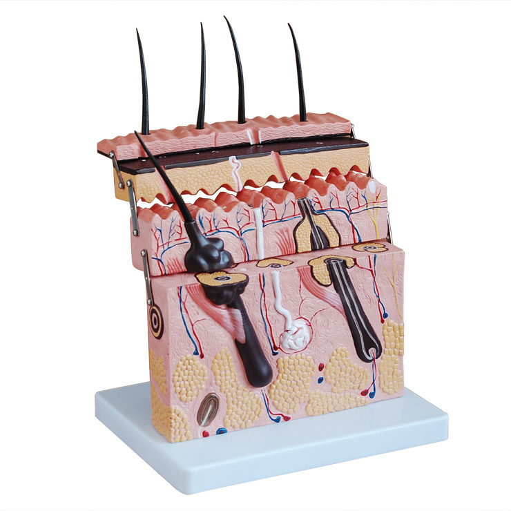 本模型顯示了皮膚的不同層次,用于學(xué)習(xí)頭發(fā)、汗腺、皮膚感覺器官等基礎(chǔ)知識。側(cè)鉸鏈連接,放于底座上。