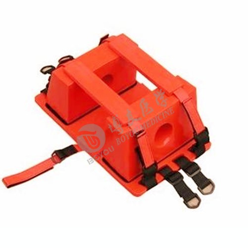 有高密度的塑料材料制成,頭部兩側設有兩個圓形耳洞,用來觀察出血或引流。整體材料無金屬成份,無需脫掉頭部固定器即可進行X光透視,CT掃描,核磁共振。成像檢查。具有防水﹑易清潔﹑防病毒感染等功能??膳溆诩顾璋搴顽P式擔架使用。