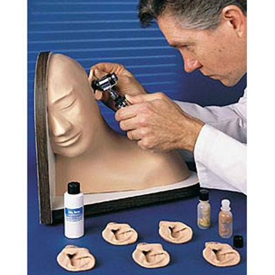 該模型包括:正常的鼓膜、黏液樣的耳炎介質、液體狀的血清耳炎介質、耳穿孔慢性耳炎介質可以進行清理耵聹練習的耳朵