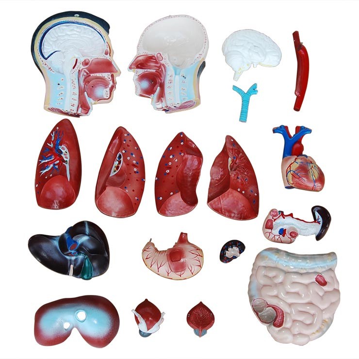 分成19件:軀干,頭(2件),腦,肺(4件),心,氣管,食管和主動(dòng)脈,橫膈膜,胃,十二指腸帶胰腺和脾,腸,腎,肝和膀胱(2件)。