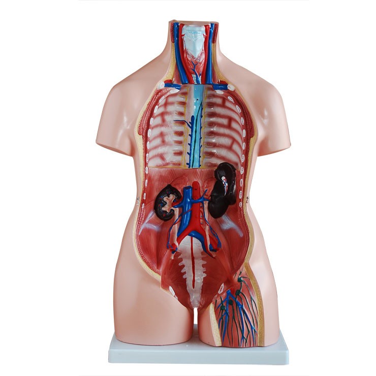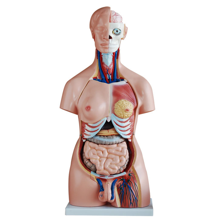 博友BOU-XC208兩性互換軀干模型85cm(40件)這款兩性軀干模型分成40件:軀干,女性胸腔蓋,頭,眼球,腦(8件),脊椎神經(jīng)(4件),肺(4件),心(2件),氣管,食管和主動脈,橫膈膜,肝,腎,胃(2件),腸(4件),男性生殖器官(4件)和女性生殖器官帶胎兒(3件)。